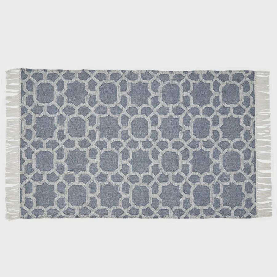 Kasbah Ink Rug is crafted from 100% recycled plastic, yet feels soft and natural underfoot. Its flat-woven design makes it super hard-wearing and perfect for busy homes, especially those with pets. With a geometric Moroccan-inspired pattern in navy and grey, it brings style and durability to any space—indoors or out.